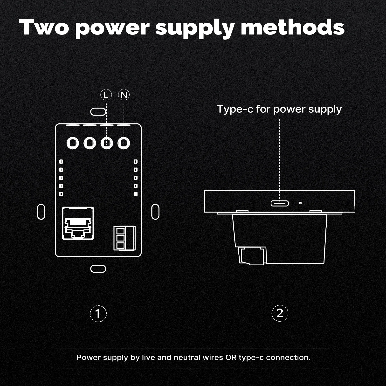 Note:Power supply by live and neutral wires OR type-c connection.